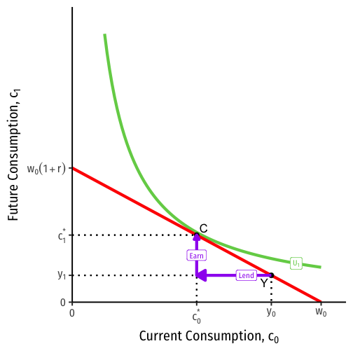 This individual will trade away (save & lend) (y0−c∗0) of c0 to earn (c∗1−y1) of c1