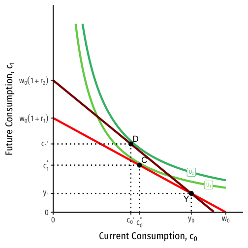 Higher interest rate r⟹ steeper line, higher cost of present consumption relative to future
